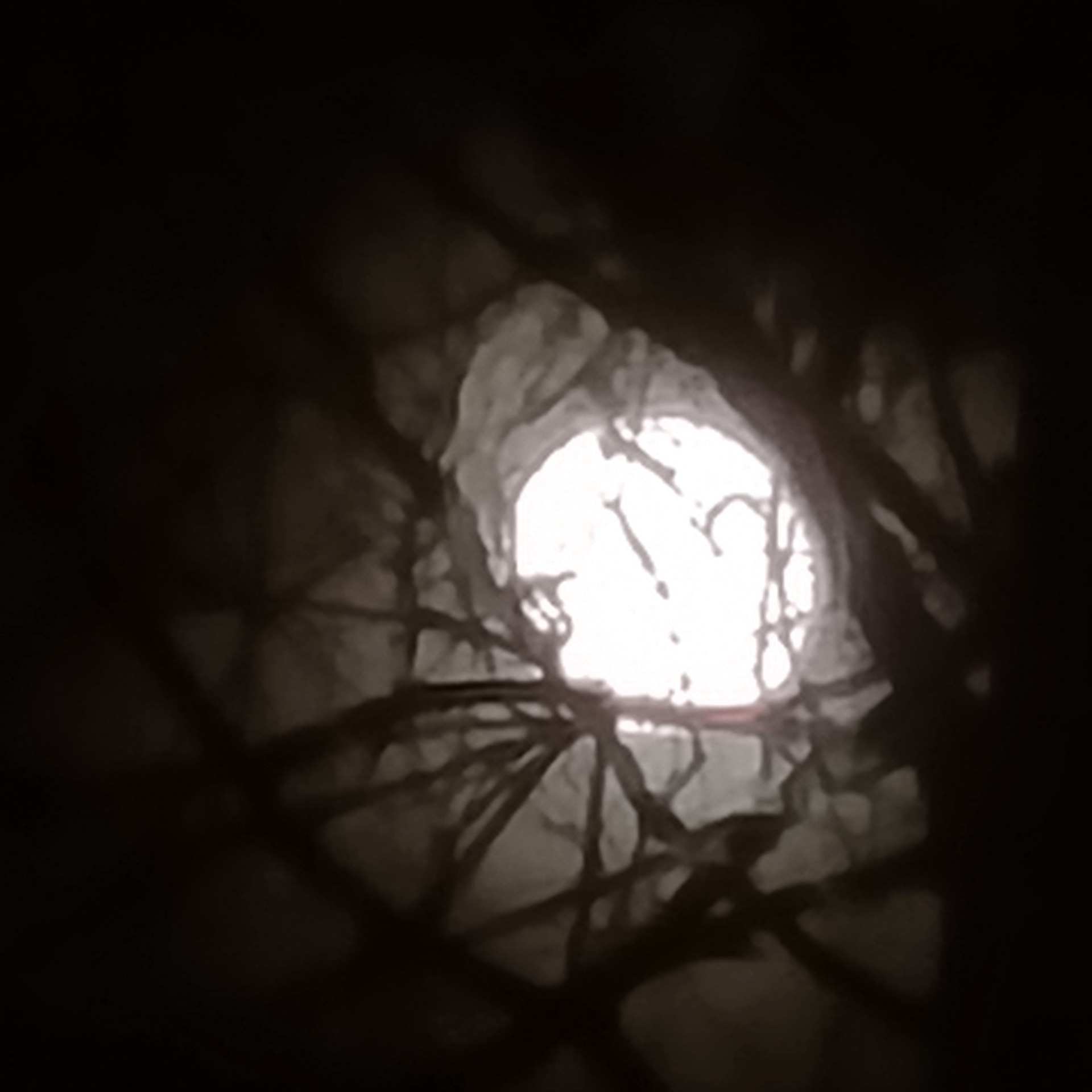 Melkein jo unohdin koko taivaalla tähyilyn, kun pilviverho oli niin tiheä, ettei oikein ollut realistista uskoa mitään näkevänsä sen läpi. Sitten yks kaks aika myöhään iltapäivällä joku kurkisti olohuoneeseen olohuoneen edessä olevan metsikön okrien välistä. Siellähän se oli! Superkuu! Pyöreä ja kaunis, mutta ei kylläkään oranssinen appelsiini! Otin kuvan kuitenkin. . Kirkas se oli. Olisi voinut luulla yhtä hyvin talviseksi auringoksi, ellei suunta olisi ollut väärä.